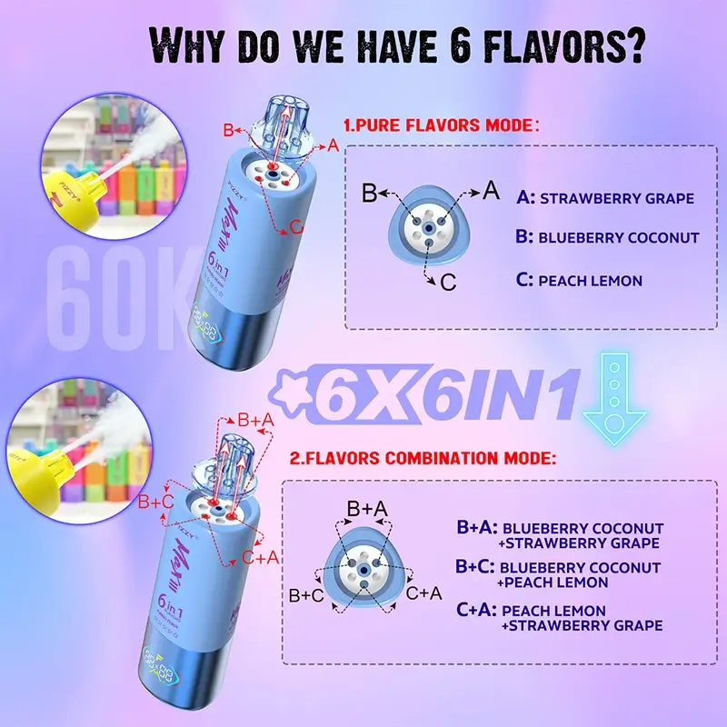 Experience 6 unique flavors (3 single + 3 blends) with a simple rotation. Enjoy up to 60,000 puffs, and a rechargeable battery in one innovative disposable vape.