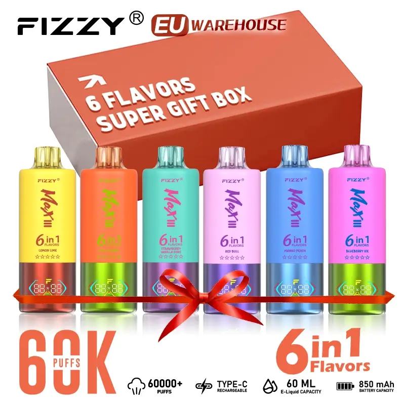 Experience endless flavor variety with the Fizzy Max III 6in1 60K rechargeable disposable vape. This 6-pack surprise collection features 6 devices, each offering up to 60,000 puffs and 6 unique flavor modes with easy mouthpiece rotation. Rechargeable, LED display, and nicotine options included for a premium vaping journey.