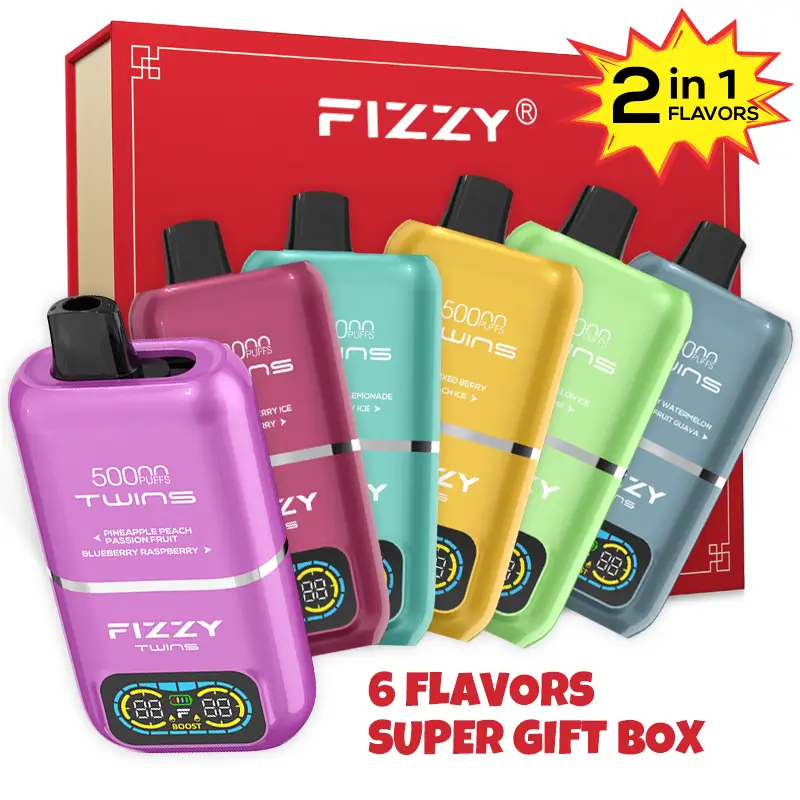 Experience the Fizzy Twins 50000 Puffs Rechargeable Disposable VapeDual Flavor 6-Pack. Each device offers two switchable flavors, up to 50,000 puffs, dual mesh coils, adjustable airflow, Eco/Boost modes, LED display, and fast USB-C charging. Perfect for flavor variety and long-lasting vaping enjoyment.